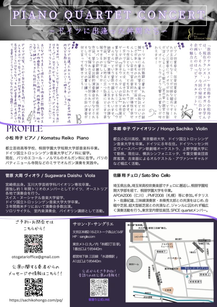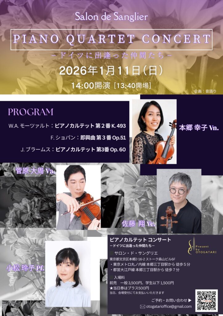 「放浪のナルシスト」を自称する小松玲子は、現在フランス・パリでオルガンを学んでいる。そんな中、今回の帰国に合わせて企画したのは『ピアノカルテット』。
